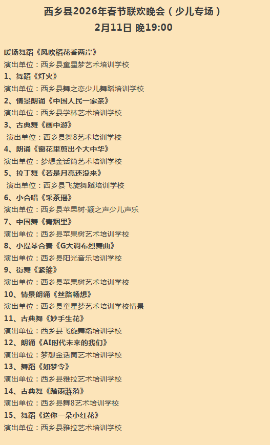 春节,是刻在中国人骨子里的团圆符号,是藏着烟火气与文化根脉的温暖时光。这个2026马年新春,由西乡县文化和旅游局主办,县文化馆承办的“茶乡新岁·驰马纳福”2026年春节群众文化汇演将在汉风廊桥激情上演,让全县人民在欢歌笑语中喜迎新春佳节。