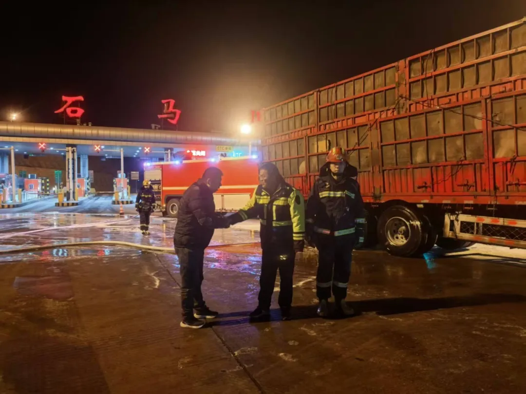 火情发生后,石马川收费站当班班长第一时间上报值班站长。值班站长当即启动应急预案,赶赴现场组织救援处置。收费员与后勤人员分工协作、高效联动:专人疏导过往车辆、设置警示标识,严防次生事故;收费班长手持灭火器对准起火部位扑救;收费站工作人员迅速对接119消防部门,全程保持信息畅通。整个处置过程紧张有序、配合默契,全体工作人员奋力扑救,火势迅速得到控制,为后续消防救援争取了宝贵时间。从发现险情到明火彻底扑灭,全程耗时不足十分钟。事后,货车司机紧握工作人员双手连连致谢,动情表示:“多亏了收费站同志们及时出手,不然后果不堪设想!”