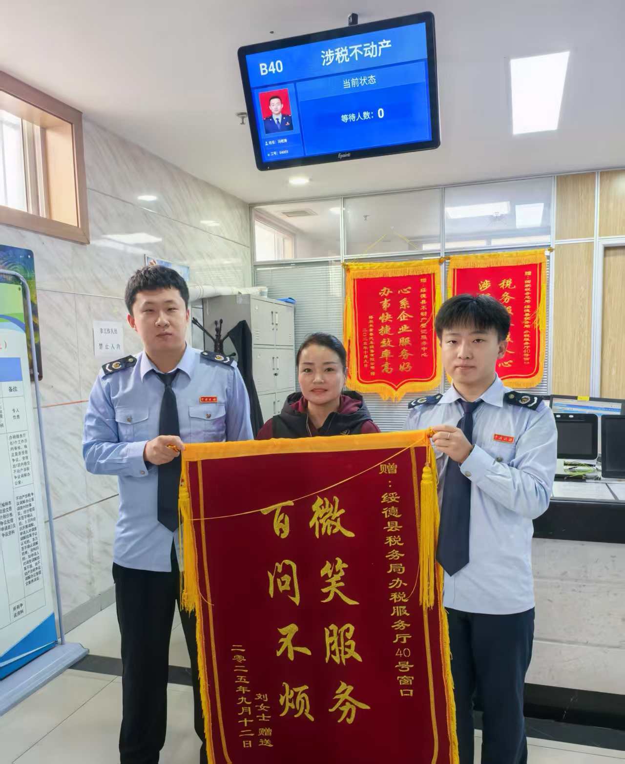 “十几年的历史遗留难题,现在终于解决了,拿到产权证,多亏税务部门的多方沟通协调,为你们的暖心服务点赞!”10月15日,纳税人刘女士对绥德县税务局第一税务分局工作人员的高效服务和暖心帮助表示了感谢,并把一面写着“微笑服务 百问不烦”的锦旗送到了工作人员手上。