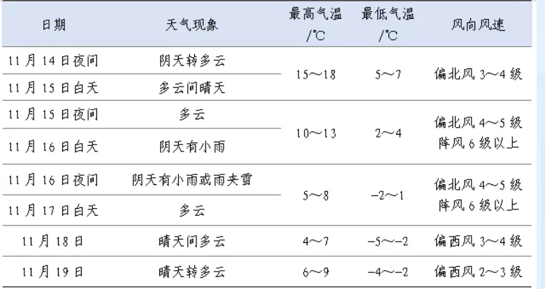 降温:主要降温时段在16日夜间到17日夜间,过程日平均气温下降8~11℃。最低气温出现在17日和18日清晨,-5~-2℃。