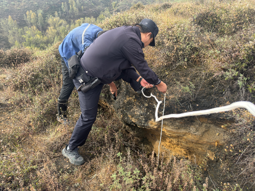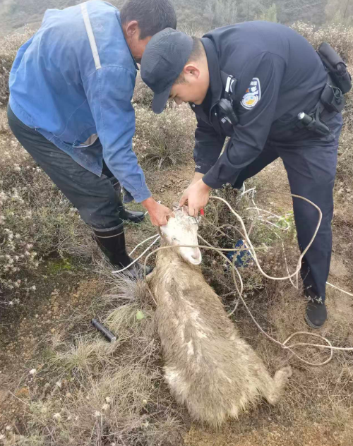 10月11日,府谷县公安局清水派出所接到一起特殊求助报警:清水镇一村民樊某英焦急地称,其父亲樊某荣放养的一只羊不慎卡入石缝,多次尝试救援未果。值班民警迅速携带救援装备赶赴现场。