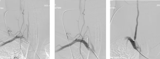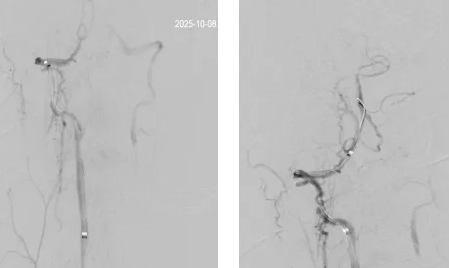 席聪准确锁定患者基底动脉处血栓,采用抽吸取栓技术快速开通血管,成功取出堵塞部位2cm的血栓。再次造影示:右侧大脑后及双侧小脑上动脉再通,右侧大脑后动脉P3段以远闭塞,考虑慢性闭塞,推注替罗非班,血流明显加快。随后采用支架植入术开通右侧椎动脉开口处,术中影像显示:支架贴壁良好,无明显残余狭窄,颅内血管显影良好。