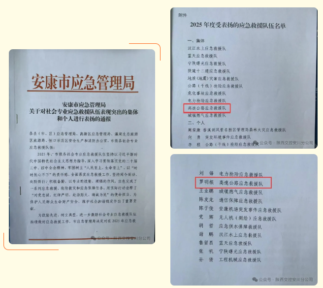 2月6日,安康市应急管理局召开市级社会专业应急救援队伍总结表彰大会,对2025年度在应急救援工作中表现突出的单位和个人予以表彰。其中,陕西交控安川分公司专职消防救援队和1名职工分别荣获表彰。