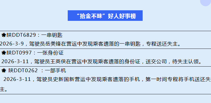 3月春风暖,文明新风伴车行。近期,咸阳安达出租汽车有限公司驾驶员拾金不昧好人好事接连不断,用真诚与担当擦亮城市文明窗口,用实际行动传递行业正能量。