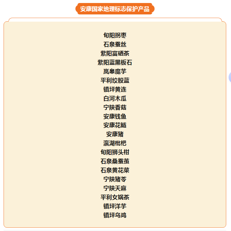 此次新增的12件国家地理标志保护产品,分别为安康钱鱼、安康花鲢、安康猪、瀛湖枇杷、旬阳狮头柑、石泉桑蚕茧、石泉黄花菜、宁陕猪苓、宁陕天麻、平利女娲茶、镇坪洋芋、镇坪乌鸡,均为安康市极具地域特色的优质农产品,融合了当地悠久的种植传统和精湛的生产工艺,是名副其实的“土特产”金字招牌。